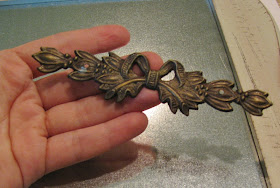 I then glued a fun little metal accent to the center of the top part of the frame. If you can't find a metal accent at your local craft store, a decorative wood accent that can be found in the trim section at Lowe's, could be painted and used instead.